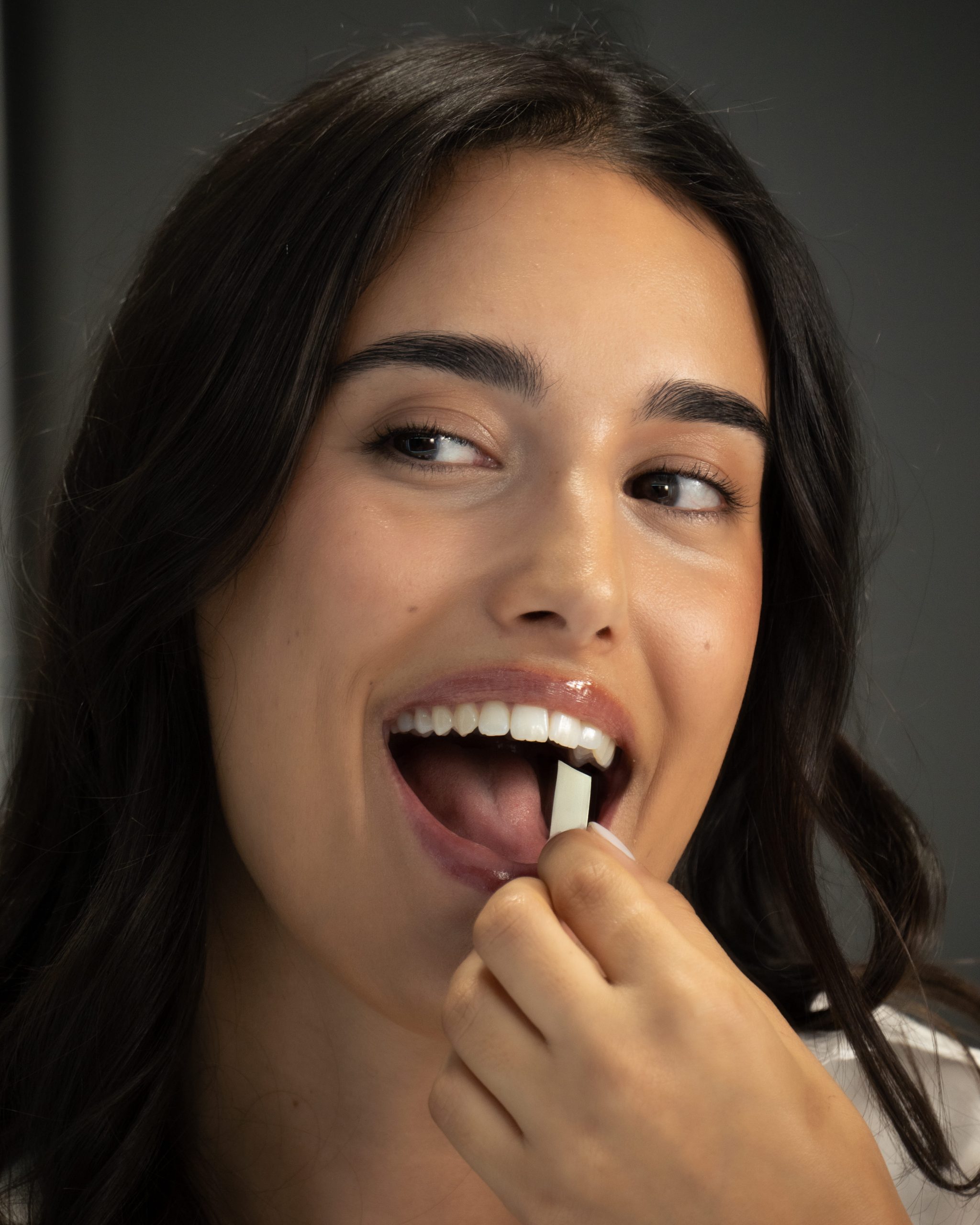 Se coloca en la mejilla y se disuelve de forma cómoda. Pensado para integrarse en tu rutina nocturna, sin esfuerzo.